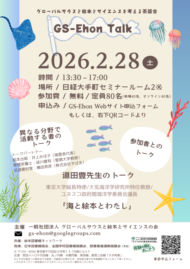 ■➂「サイエンスの絵本を推奨する」の活動は、いよいよ、2026年2月28日から始まります。第3回茶話会のトークテーマは「海と絵本とわたし」(ゲストスピーカー:道田豊東大総長特使・名誉教授・ユネスコ政府間海洋学委員会議長)です。詳細は次節で。